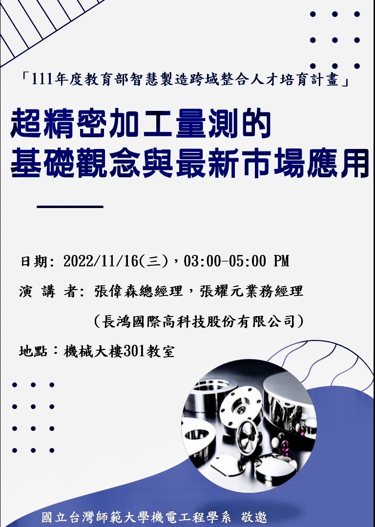 長鴻國際高科技公司受邀台灣師範大學機電工程學系於「超精密加工量測的基礎觀念與最新市場應用」講座,圓滿成功!